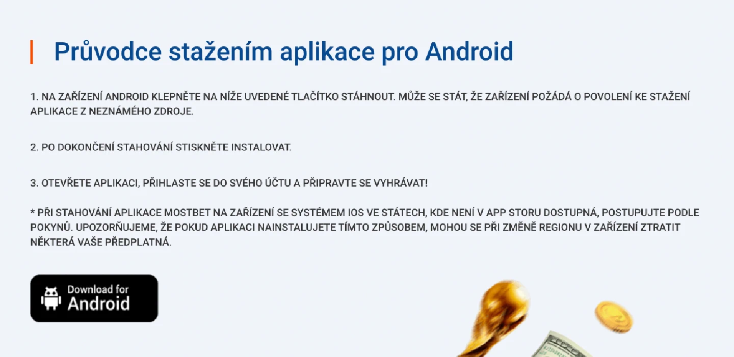 Mostbet applicazione Android se instaluje prostřednictvím oficiálních webových stránek. Nástroj si můžete snadno stáhnout a nainstalovat pomocí stručného návodu. Nezapomeňte však, že vaše zařízení musí mít operační systém verze 4.4 nebo vyšší, aby program fungoval stabilně. Chcete-li aplikaci aktualizovat, stačí se vrátit na oficiální webové stránky a nástroj znovu stáhnout.